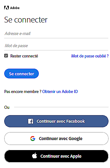 Enregistrez-vous grâce à l’identifiant (adresse mail) et le mot de passe préalablement créés lors de l’ouverture de votre compte Adobe (Etape 1).