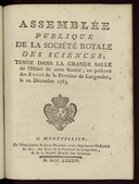 Les lacunes de 1709 à 1728 et 1751 à 1770 proviennent du refus fait à ces 2 époques par les Etats de fournir aux frais de l'impression, bien que les séances publiques annnuelles fussent régulièrement tenues. Contient : Eloge de M. Chirac. Extrait du mémoire de M. Rideux sur la nature & sur les proprietez des eaux d'Iuset ; Extrait du mémoire de M. Fizes sur les raports des vitesses du mouvement des tuniques des vaisseaux du corps humain.<br/>