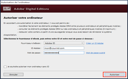 de votre compte Adobe vous seront demandés. Sur votre ordinateur, depuis le logiciel Adobe Digital Editions,