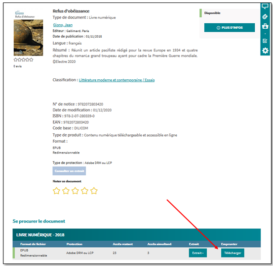 Le téléchargement d'un livre numérique est également accessible à partir de "Compte lecteur" > "Emprunts numériques" > "Prêts" > "Actions : Télécharger".