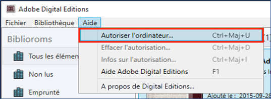 Une fois installé, ouvrez le logiciel Adobe Digital Editions. Une fois sur la page d’accueil, cliquez sur « Aide », puis sur « Autoriser l’ordinateur »