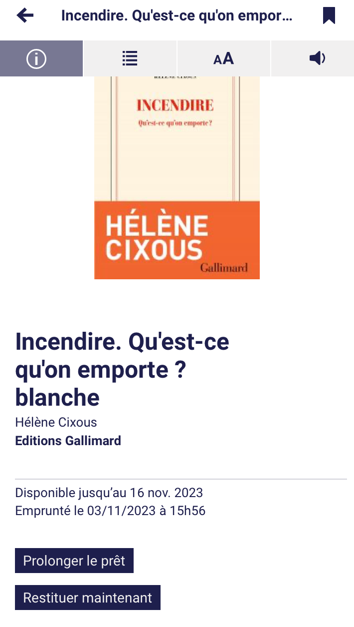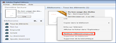 Si le message signale qu'un emprunt est déjà en cours, retéléchargez le livre depuis le compte lecteur > "emprunts numériques" >"prêts" > "actions" > "Télécharger".