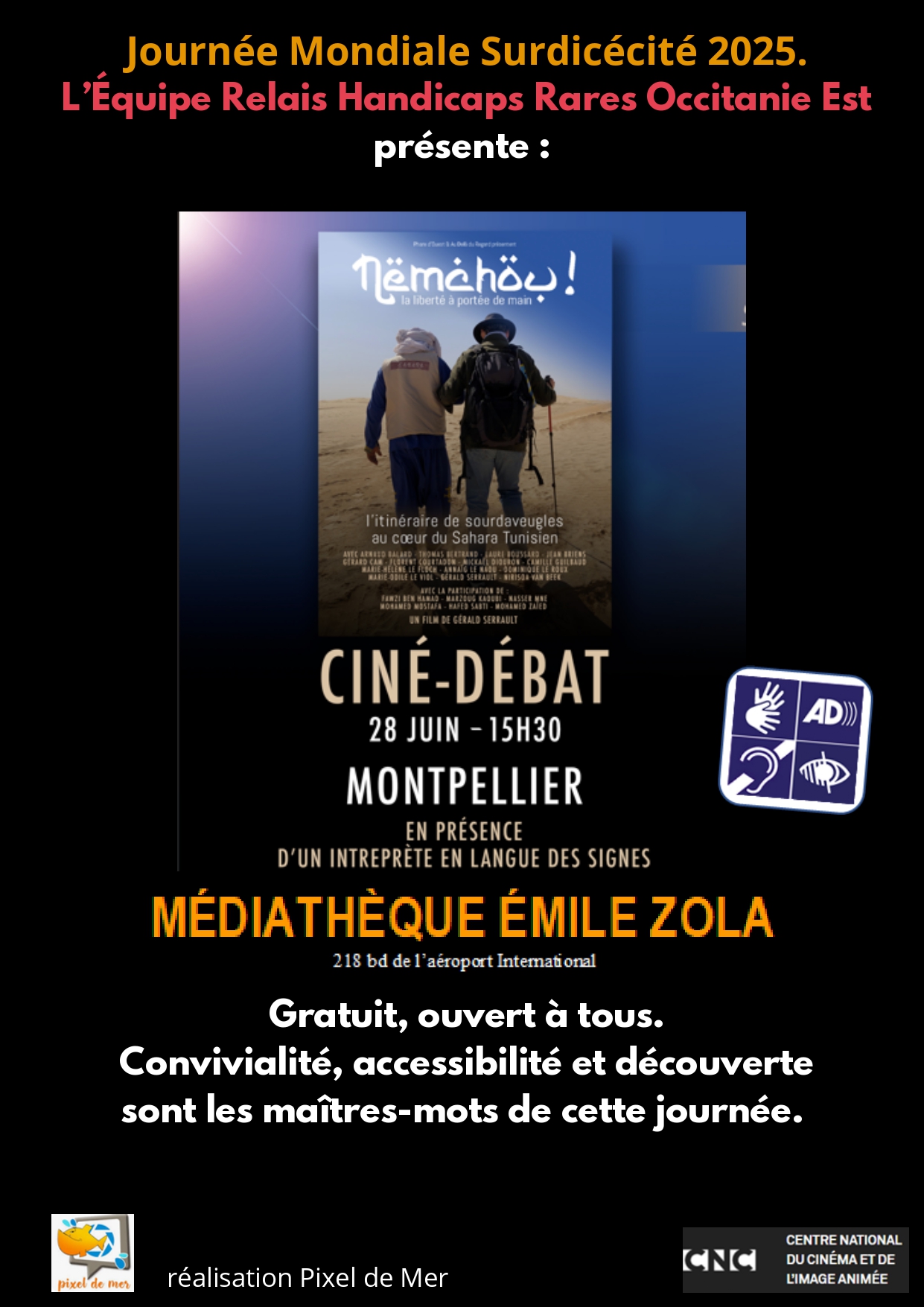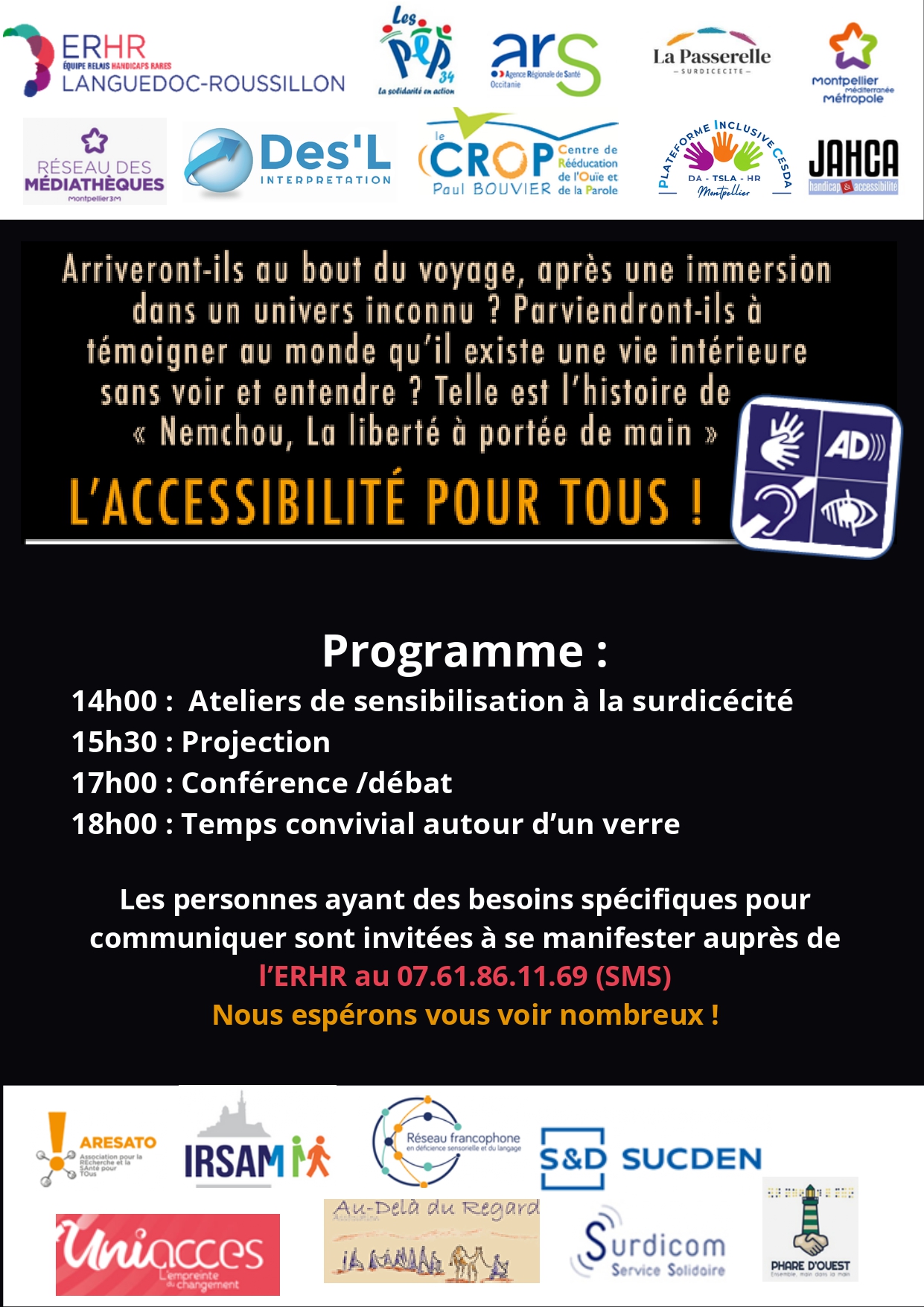 Cette rencontre, organisée en partenariat avec l’Equipe Relais Handicaps Rares (ERHR) Occitanie Est des PEP34, l’ARS Occitanie, l’association La Passerelle Surdicécité, Des’L, le CROP Paul Bouvier, la Plateforme Inclusive Cesda, ARESATO, IRSAM, RFDSL, Au-Delà du Regard, S&D SUCDEN, Surdicom et Phare d’Ouest, vise à mieux faire connaître ce handicap rare et méconnu, reconnu en 2021.