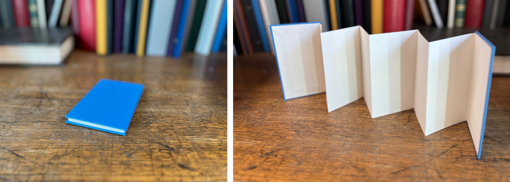 Après une présentation de l’atelier de reliure londonien Wyvern Bindery, dans lequel Pauline Leclercq travaille et une présentation des matériaux et outils, l’intervenante propose une reliure accordéon étapes par étapes – « nous plierons le papier, couvrirons les cartons en toile de couleur et finirons la reliure que vous pourrez garder à la fin du cours. »