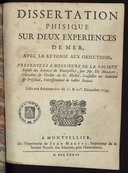 - Les lacunes de 1709 à 1728 et 1751 à 1770 proviennent du refus fait à ces 2 époques par les Etats de fournir aux frais de l'impression, bien que les séances publiques annnuelles fussent régulièrement tenues. Contient : Dissertation phisique (sic) sur deux expériences de mer avec la réponse aux objections présentées à messieurs de la Société Royale des Sciences de Montpellier par Mr Milhau... lues aux assemblées du 1er & 22 décembre 1735.