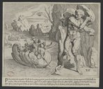 Relevé d'inscription sur le document : Dans la composition, le monogramme «TVT» et le chiffre «12». Sous la composition : « Polipheme maudit Ulysse & ses compagnons, pour le desplaisir qu’il a de leur sortie, & jette apres eux une masse de rocher. Par où il nous est déclaré, Que le Ciel punit toujours la supercherie des Ames lasches, Qu'il y a de la brutalité dans tous leurs efforts contre les gens de bien, & que les iniures iointes aux blasphemes, sont les dernieres armes que la colere leur met en main. »<br/>