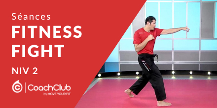 Description : Pas besoin d’être un expert en art martial pour s’adonner au Fitness Fight ! Cette discipline, mélange de fitness, de différentes techniques de sports de combat et d’arts martiaux traditionnels (boxe, kick-boxing, judo et jujitsu) a été spécialement créée par CoachClub dans le but de vous faire bouger en investissant le monde des arts martiaux.Avec le Fitness Fight, enchainez force de frappes, coups de poings, coups de pieds, travail de postures, pour muscler toutes les parties de votre corps. Il n’y a aucun risque de se faire mal puisque tous les coups se donnent dans le vide et qu’il ne s’agit pas d’une discipline de combat ou de défense.Des séries d’exercices de musculation, comme les pompes ou les crunchs, viennent compléter la séance qui se termine par des étirements.Avec le Fitness Fight, vous allez aussi augmenter vos capacités de coordination, votre habileté motrice, votre agilité et améliorer votre force abdominale, votre posture et votre stabilité. Découvrez vite l’intégralité des séances de Fitness Fight, une discipline idéale pour vous muscler avec un coach spécialiste des arts martiaux.