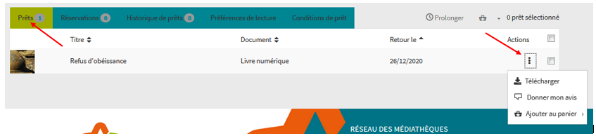 Le téléchargement d'un livre numérique est également accessible à partir de "Compte lecteur" > "Emprunts numériques" > "Prêts" > "Actions : Télécharger".